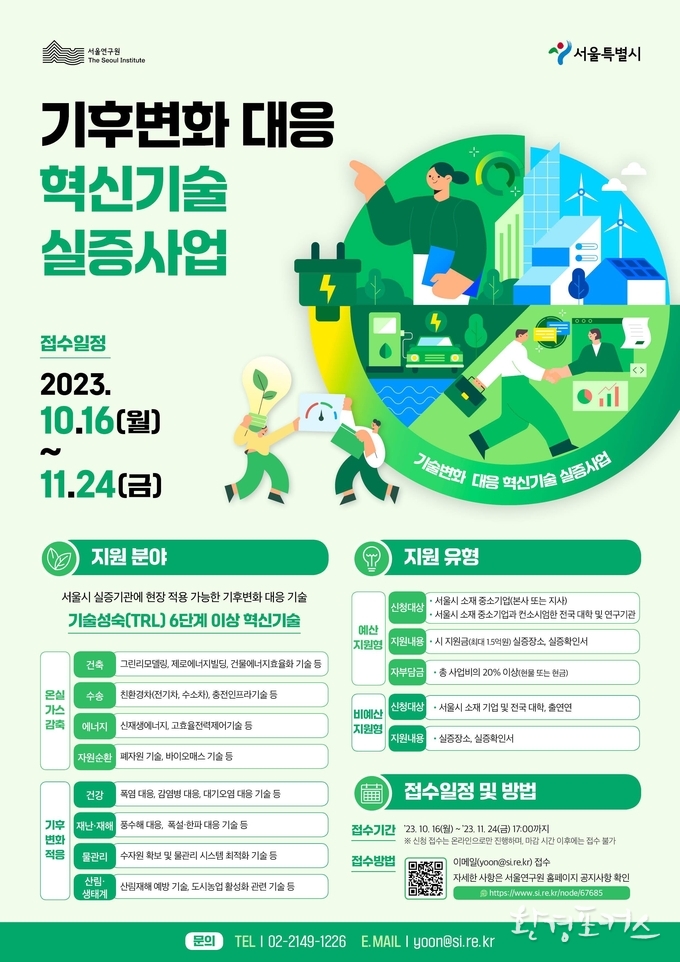 모집 대상은 서울 소재 중소기업 및 대학, 연구기관으로, 오는 11월 24일까지 신청받는다. 온실가스 감축 분야와 기후변화적응 분야 기술성숙도(TRL:Technology Readiness Level) 6단계 이상 혁신기술을 대상으로 지원하며, 실증 비용(최대 1억 5천만원)과 장소를 지원하는 예산지원형과 실증 장소만 지원하는 비예산 지원형으로 나뉜다.