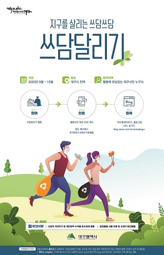 [환경포커스=전국] 대구시는 기후 위기에 대한 인식변화와 저탄소생활 실천 유도를 위해 건강과 환경을 동시에 지킬 수 있는 '쓰담달리기' 참여 SNS 이벤트를 9∼10월까지 진행한다고 밝혔다.