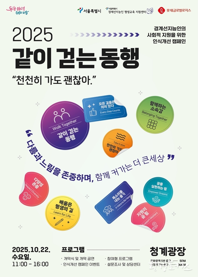 전체 인구의 약 13.59%로 추정되는 경계선지능인에 대한 사회적 이해를 높이고 포용적 사회 분위기를 확산하기 위한 취지다. 올해 3회째인 이번 행사는 슬로건 ‘같이 걷는 동행, 천천히 가도 괜찮아’를 내걸고 시민 체험형 프로그램으로 구성됐다. 시민 7천500여 명이 행사를 찾아 다양한 체험활동에 참여했다.