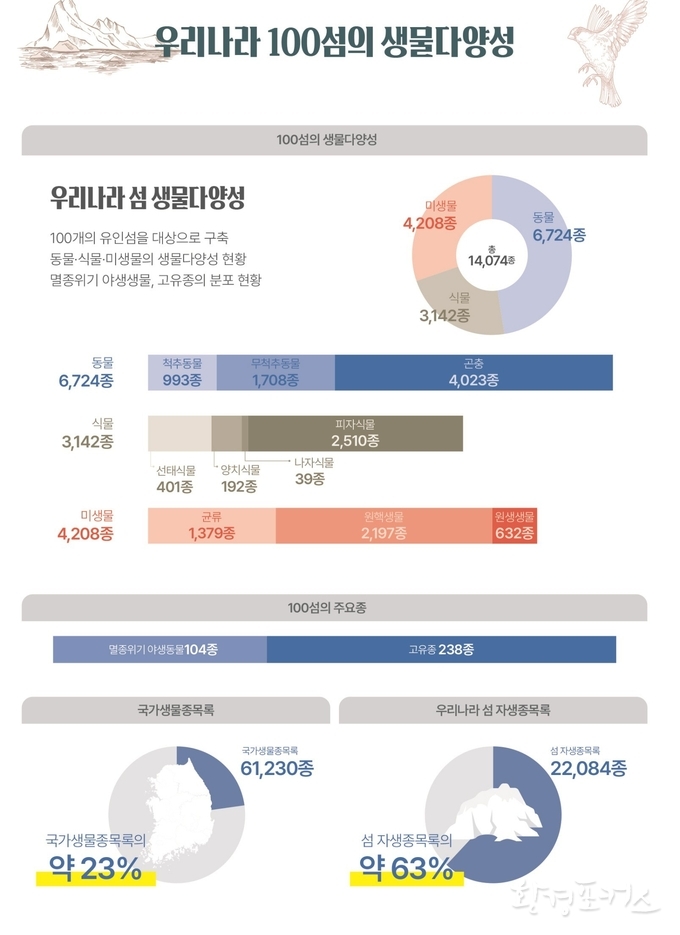 5년간 섬 생물다양성 조사를 통해 총 1만 4,074종(동물 6,724종, 식물 3,142종, 미생물 4,208종)을 확인했다. 이는 국가생물종목록 6만 1,230종의 약 23%를 차지하며, 우리나라 섬 자생종목록 2만 2,084종의 약 63%에 해당한다.