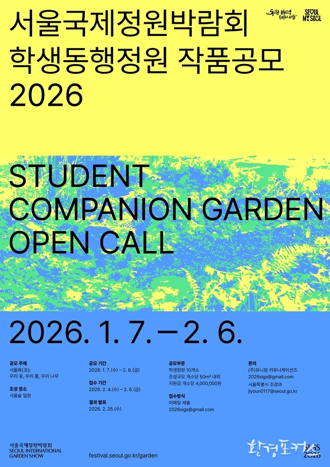 [환경포커스=서울] 서울시는 창의적인 정원 디자인 발굴과 정원문화 확산을 위해 이달 7일 수요일부터 다음달 6일 금요일까지 「2026 서울국제정원박람회」 학생동행정원(이하 학생정원) 및 시민동행정원(이하 시민정원) 작품공모를 진행한다고 전했다.