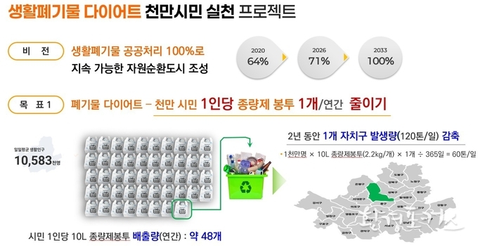 「생활폐기물 다이어트 천만 시민 실천 프로젝트」 목표인 ‘1인당 연간 종량제봉투 1개 줄이기’는 일평균 생활 인구 1천만 명 기준, 하루 약 60톤 감량에 해당하는 양으로 목표치만큼 감량에 성공하게 되면 2년간 약 4만4천 톤을 감량하게 된다.