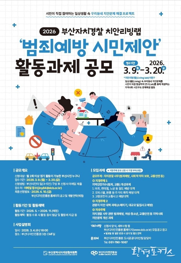 [환경포커스=부산] 부산시 자치경찰위원회(이하 위원회)는 (재)부산디자인진흥원과 함께 오는 3월 9일부터 20일까지 「2026년 부산자치경찰 치안리빙랩 공모전」을 개최한다고 전했다.