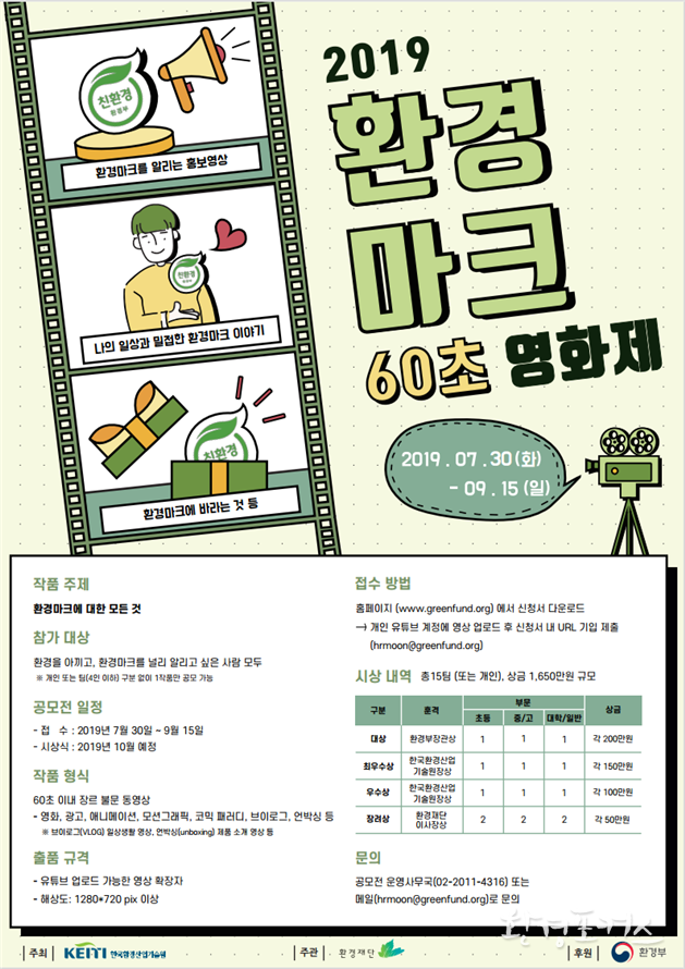 [환경포커스=서울] 환경부 산하 한국환경산업기술원(원장 남광희)은 ‘환경표지(마크) 60초 영화제’ 공모전을 환경표지 제도를 널리 알리고 환경표지 인증제품을 통한 친환경생활 문화 확산을 위해 개최한다.