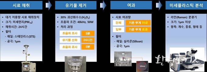이번에 개발한 기술은 대기 중 시료를 채취해 유기물 제거 및 여과 후, 라만 분광기를 활용해 미세플라스틱 개수와 종류를 분석하는 방식으로 대기 중 1㎛ 크기 작은 미세플라스틱 개수와 종류까지 정확하게 분석해 낼 수 있다.