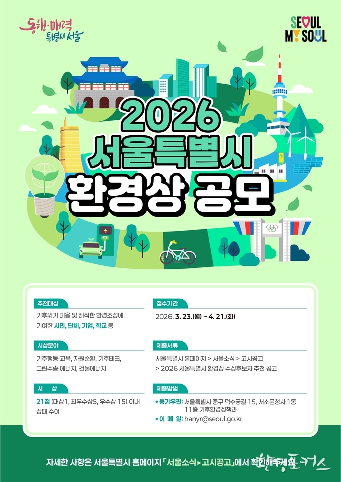 「2026년 서울특별시 환경상」은 기후행동·교육, 자원순환, 기후테크, 그린수송·에너지, 건물에너지 총 5개 분야에서 대상 1명, 최우수상 5명, 우수상 15명 등 총 21명(시민, 단체, 기업)을 선정해 시상할 계획이다.