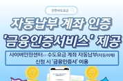 [환경포커스=인천] 인천광역시 상수도사업본부는 시민이 편리한 수도요금 납부 디지털 환경 조성을 위해, 계좌 자동납부 신청에 ‘금융인증서비스’를 도입했다고 8일 전했다. 그동안 수도요금 계좌 자동납부 서비스를 신청하는 민원인은 전자서명 수단으로 공동인증서를 이용했다. 공동인증서는 인증서를 컴퓨터나 별도의 저장매체 등에 보관해야 하고, 기기 간 이동이나 복사 절차가 필요해 이용 과정에서 번거로움이 있었다. 이에 인증 수단으로 금융인증서비스를 추가 도입했다. 금융인증서비스는 클라우드 기반으로 인증서를 별도로 저장하지 않아도 되는 방식으로, 저장매체 없이 간편하게 인증할 수 있다. 상수도사업본부는 인증 방식 개선에 더해 자동납부 제도 전반의 편의성 향상에도 힘쓰고 있다. 올해 1월부터 시행한 ‘카드 자동납부 당월 또는 익월 선택 적용 서비스’는 시민들로부터 높은 호응을 얻고 있다. 신청 시점과 관계없이 다음 달부터 적용되던 기존 방식의 불편을 해소한 것이 특징이다. 제도 개선 이후 시민은 자동납부 적용 시점을 직접 선택할 수 있게 됐다. 그 결과 신청자의 87% 이상이 당월 적용을 선택하는 등 실질적인 이용 편의 향상이 확인됐다. 이는 시민 수요를 반영한 정책 개선
