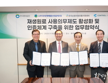 [환경포커스=서울] 국내 재생원료 사용 의무화 제도 도입 및 확대에 발맞춰 ‘회수-생산-사용’으로 이어지는 재활용가능자원의 전 과정 선순환 체계를 구축하고, 시장 활성화를 위한 기반이 마련된다. 한국순환자원유통지원센터(이사장 이명환, 이하 “센터”), 한국환경공단(임상준 이사장 이하 “공단”), (사)한국포장재재활용사업공제조합(김동진 이사장 이하 “조합”), ㈜컨트롤유니온코리아(대표 계성경, 이하 “컨유”)는 11월 10일 롯데호텔 서울(서울시 중구)에서 「재생원료 사용의무제도 활성화 및 인증체계 구축을 위한 업무협약」을 체결했다. 이번 협약은 기존 3자(공단-센터-컨유) 협력 체계에 재생원료의 수요자인 재활용의무생산자 단체(조합)를 포함하여 협력 범위를 확대하고, 재활용제품의 공급망에 대한 안정성 확보를 통한 고품질 재활용 체계를 구축하는 것을 목적으로 한다. 특히, 국내 재생원료 사용 의무화 제도 도입 및 확대에 발맞춰 ‘회수-생산-사용’으로 이어지는 재활용가능자원의 전 과정 선순환 체계를 구축하고, 시장 활성화를 위한 기반 마련에 초점을 맞췄다. 센터에서는 재생원료의 공급자인 회수‧재활용사업자를 대상으로 품목별로 GRS, ISCC+, RecyClass
