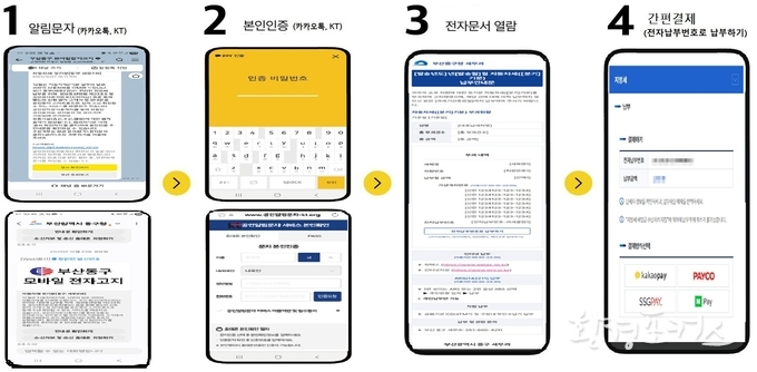 [환경포커스=부산] 부산시는 기존 우편(종이) 송달하고 있는 지방세 관련 각종 고지·안내문을 전자문서 형태로 공인전자문서중계자(카카오, KT, SKT, LGU+) 문자 메시지로 전송하는 '모바일 전자고지 서비스'를 2월부터 본격 시행한다고 전했다.