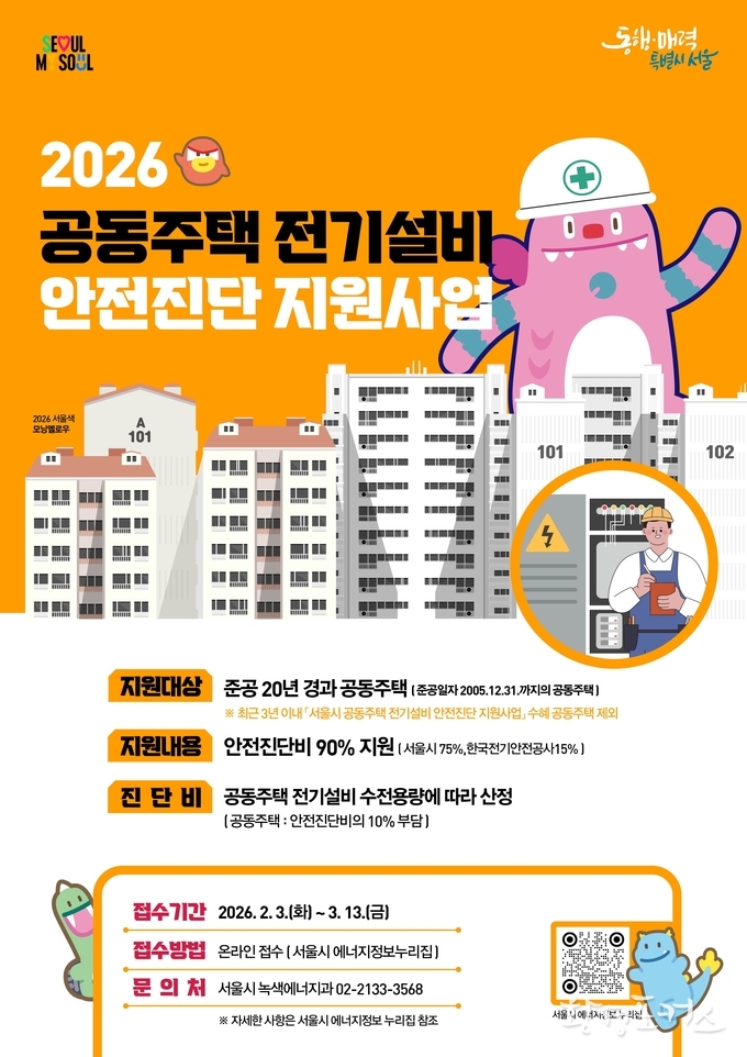 신청은 2월 3일(화)부터 3월 13일(금)까지 서울시에너지정보 누리집(https://energyinfo.seoul.go.kr)에서 온라인으로 받는다. 선정 결과는 4월 중 같은 누리집을 통해 공지되며, 진단은 한국전기안전공사가 수행한다.