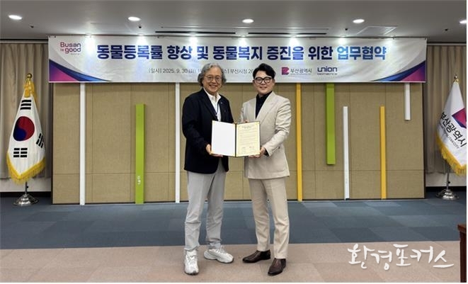 [환경포커스=부산] 부산시는 동물등록률 향상 및 동물복지 증진을 위해 30일 오전 10시 시청 26층 회의실에서 '㈜유니온바이오메트릭스'와 업무협약(MOU)을 체결했다고 전했다.