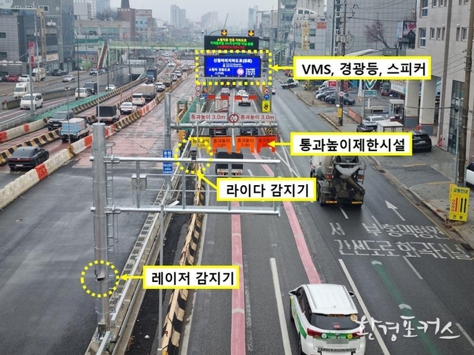차량의 형상을 인식하는 ‘인공지능(AI) 라이다’와 높이를 정밀하게 확인하는 ‘레이저’를 활용한 이중 감지 방식으로 차량 높이를 자동 판별한다. 높이 제한을 초과한 차량이 감지되면 대형 디지털 안내표지판(VMS), 경광등, 지향성 스피커를 활용한 음성 안내를 통해 운전자에게 지하도로 진입 금지와 우회 경로를 즉시 안내한다.