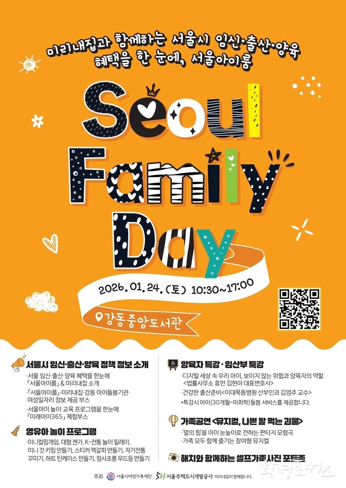 서울패밀리데이는 미리내집 입주민과 강동 지역 주민을 대상으로 서울시 임신·출산·양육 정책을 한자리에서 안내하는 서울아이(i)룸 팝업스토어로, 1월 24일(토) 강동중앙도서관에서 열린다.