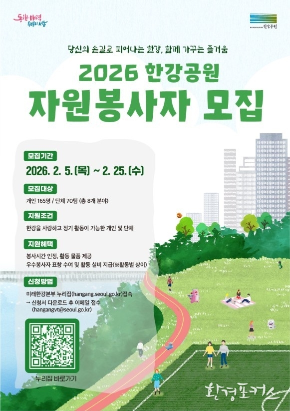 또한, 단체 봉사자를 위한 활동도 지속된다. ▲환경정화와 녹지대 가꾸기를 통해 한강 전역을 돌보는 ‘한강 지킴이’ ▲예술적 재능으로 노후 시설물을 새롭게 꾸미는 ‘재능기부 벽화봉사단’ 등 기존의 인기 분야에 신규 기획형 봉사단을 더해, 보다 풍성하고 체계적인 자원봉사 생태계를 구축할 계획이다.