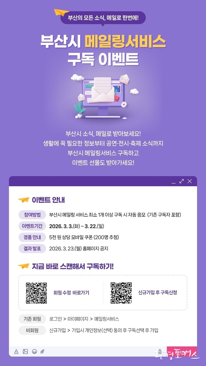 [환경포커스=부산] 부산시는 시민들이 주요 시정 소식과 생활 정보를 보다 신속하고 편리하게 받아볼 수 있도록 오는 3월 3일부터 3월 22일까지 '부산시 소식, 메일로 한 번에(메일링 서비스 구독 이벤트)'를 추진한다고 전했다.