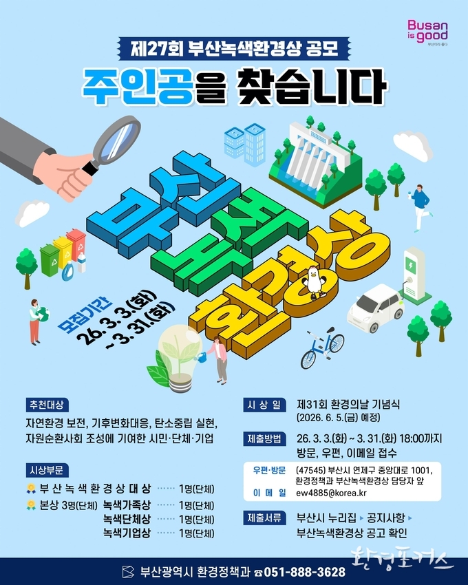 [환경포커스=부산] 부산시는 저탄소 그린도시 조성에 앞장서고 지역 환경보전과 환경분야 발전에 기여한 '부산녹색환경상' 후보자를 3일부터 오는 3월 31일까지 추천받는다고 전했다.