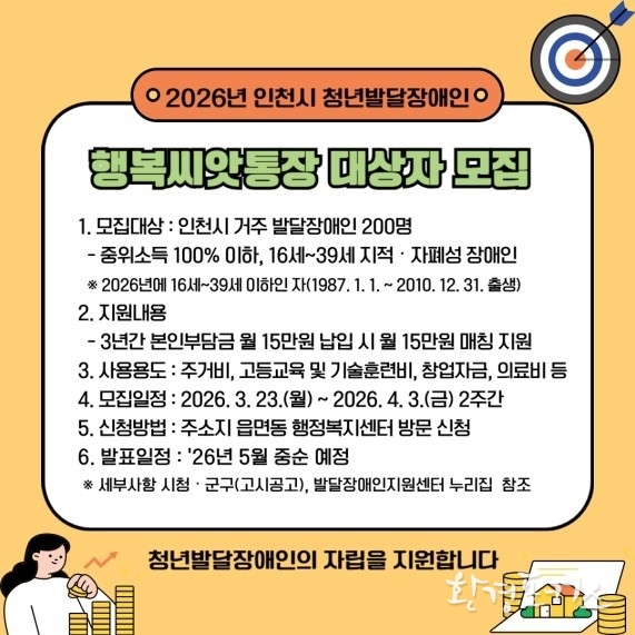 [환경포커스=인천] 인천광역시는 청년 발달장애인의 자산 형성을 지원하는 ‘행복씨앗통장’사업의 2026년도 대상자 200명을 모집한다고 전했다.