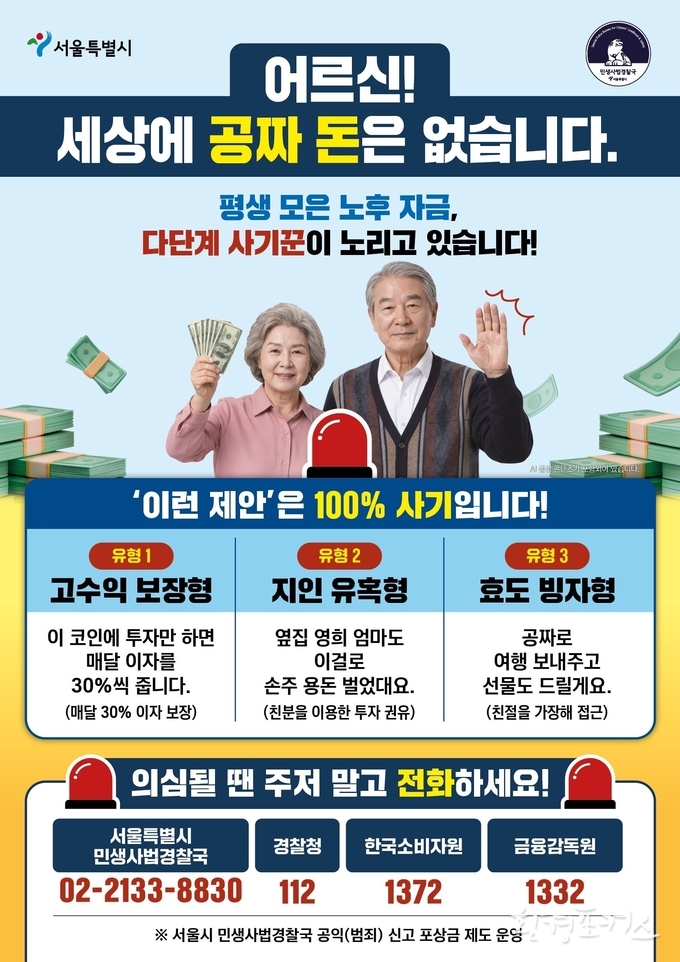 [환경포커스=서울] 서울시 민생사법경찰국(이하 ‘민사국’)은 최근 고령층의 노후 자금을 노린 불법 다단계 및 가상자산 연계 금융 사기가 지능화됨에 따라, 정보 취약계층인 어르신들의 피해를 막기 위한 ‘선제적 예방 홍보 및 수사 연계 계획’을 본격 시행한다고 전했다.
