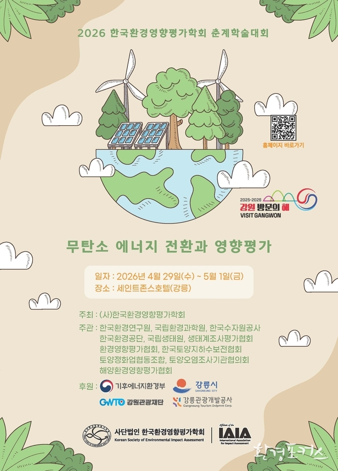 키워드:한국환경영향평가학회, 춘계학술대회, 무탄소 에너지 전환, 환경영향평가, 재생에너지, 생물다양성, 기후변화 대응, AI 환경평가, 강릉 세인트존스호텔, 환경정책 학술대회