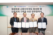 [환경포커스=서울] 국내 재생원료 사용 의무화 제도 도입 및 확대에 발맞춰 ‘회수-생산-사용’으로 이어지는 재활용가능자원의 전 과정 선순환 체계를 구축하고, 시장 활성화를 위한 기반이 마련된다. 한국순환자원유통지원센터(이사장 이명환, 이하 “센터”), 한국환경공단(임상준 이사장 이하 “공단”), (사)한국포장재재활용사업공제조합(김동진 이사장 이하 “조합”), ㈜컨트롤유니온코리아(대표 계성경, 이하 “컨유”)는 11월 10일 롯데호텔 서울(서울시 중구)에서 「재생원료 사용의무제도 활성화 및 인증체계 구축을 위한 업무협약」을 체결했다. 이번 협약은 기존 3자(공단-센터-컨유) 협력 체계에 재생원료의 수요자인 재활용의무생산자 단체(조합)를 포함하여 협력 범위를 확대하고, 재활용제품의 공급망에 대한 안정성 확보를 통한 고품질 재활용 체계를 구축하는 것을 목적으로 한다. 특히, 국내 재생원료 사용 의무화 제도 도입 및 확대에 발맞춰 ‘회수-생산-사용’으로 이어지는 재활용가능자원의 전 과정 선순환 체계를 구축하고, 시장 활성화를 위한 기반 마련에 초점을 맞췄다. 센터에서는 재생원료의 공급자인 회수‧재활용사업자를 대상으로 품목별로 GRS, ISCC+, RecyClass