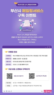 [환경포커스=부산] 부산시는 시민들이 주요 시정 소식과 생활 정보를 보다 신속하고 편리하게 받아볼 수 있도록 오는 3월 3일부터 3월 22일까지 '부산시 소식, 메일로 한 번에(메일링 서비스 구독 이벤트)'를 추진한다고 전했다. 메일링 서비스 구독 이벤트는 부산시 메일링 서비스의 인지도를 높이고 이용을 활성화하기 위해 마련됐다. 부산시 메일링 서비스는 ▲시정 소식은 물론 ▲이달의 문화·행사 ▲설문조사 등 시민 일상에 필요한 다양한 정보를 맞춤형으로 제공하고 있다. 이번 이벤트는 부산시 누리집 기존 회원 및 신규 회원을 대상으로 진행된다. 기존 회원은 누리집 로그인 후 [마이페이지] 내 [메일링 서비스] 메뉴에서 1개 이상의 소식을 구독 신청하면 자동으로 응모된다. 비회원은 회원가입 과정에서 ‘개인정보 수집 및 이용 동의(선택)’에 동의하고 메일링 서비스를 함께 신청하면 참여가 완료된다. 기간 내 구독 상태를 유지한 신규 및 기존 구독자 가운데 추첨을 통해 총 200명에게 5천 원 상당의 모바일 상품권을 지급할 예정이다. 당첨자는 무작위 추첨으로 선정해 3월 23일 부산시 누리집 공지사항(https://www.busan.go.kr/nbnews)을 통해 발표하며
